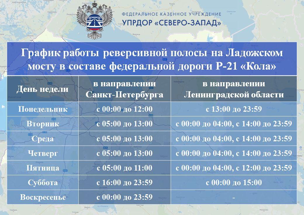 - Понедельник: с 00:00 до 12:00 движение в направлении Петербурга, с 13:00 до 23:59 — в область.