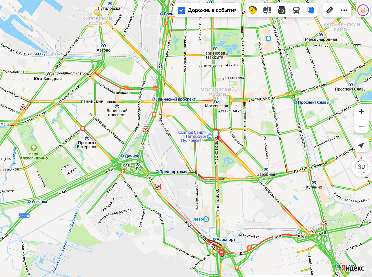 Подъезды к КАД также оказались парализованы: заторы стоят на Волхонском, Красносельском и Таллинском шоссе. К ЗСД пробки тянутся по Дачному и Ленинскому проспектам, Кубинской и Благодатной улицам. На самом ЗСД движение затруднено в районе развязок с Благодатной улицей и ШМСД.