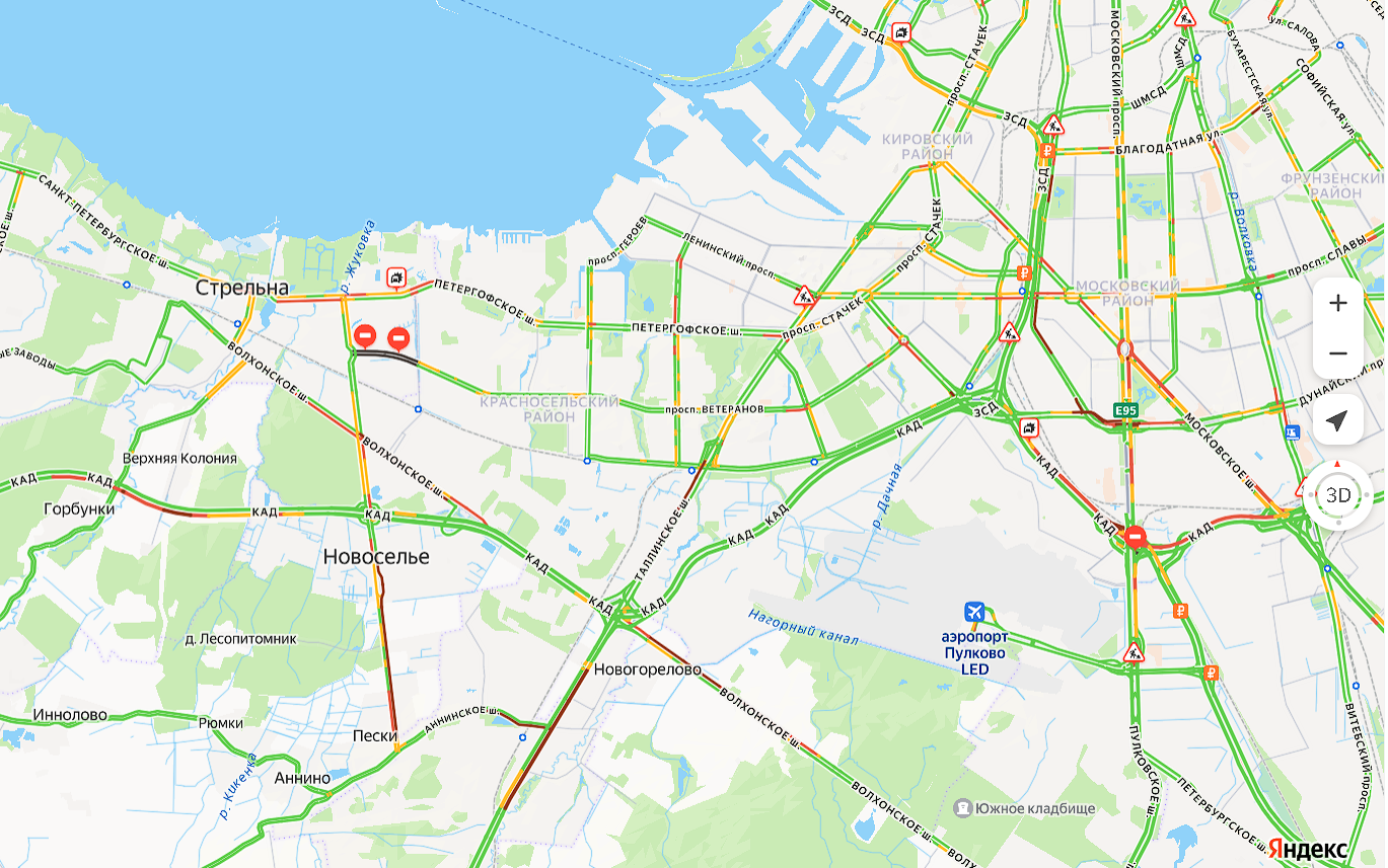 На внутреннем кольце КАД образовалась пробка длиной 5 километров — от Московского шоссе до ЗСД. Внешнее кольцо встало перед Новосельем. По сообщениям водителей, на южном участке КАД у развязки с ЗСД перестали пропускать грузовики, а въезд на сам ЗСД временно закрыт для всех видов транспорта.