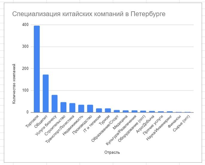 Большинство китайских компаний в Петербурге сосредоточены в торговле: 396 предприятий работают в оптовой и розничной сфере. Общественным питанием занимаются 173 компании, бизнес-услугами и консалтингом — 80. Около 5% компаний работают в строительстве, грузоперевозках, аренде недвижимости или производстве мебели и электроники. На IT и телекоммуникации приходится лишь 2%, туризм — также 2%. По 1% компаний ориентированы на образование, спорт, медицину, развлечения и культуру.