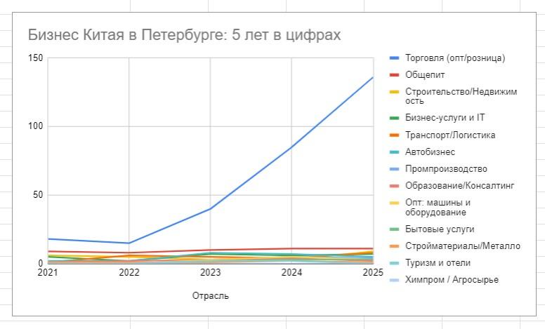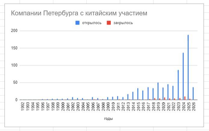 Количество новых китайских компаний, открывшихся в Петербурге за последние пять лет, демонстрирует резкий взлёт. В 2021 и 2022 годах было зарегистрировано 46 и 41 предприятие соответственно, в 2023 году — 87, а в 2024 и 2025 — 137 и 189. Всего за этот период закрылось лишь 64 компании.