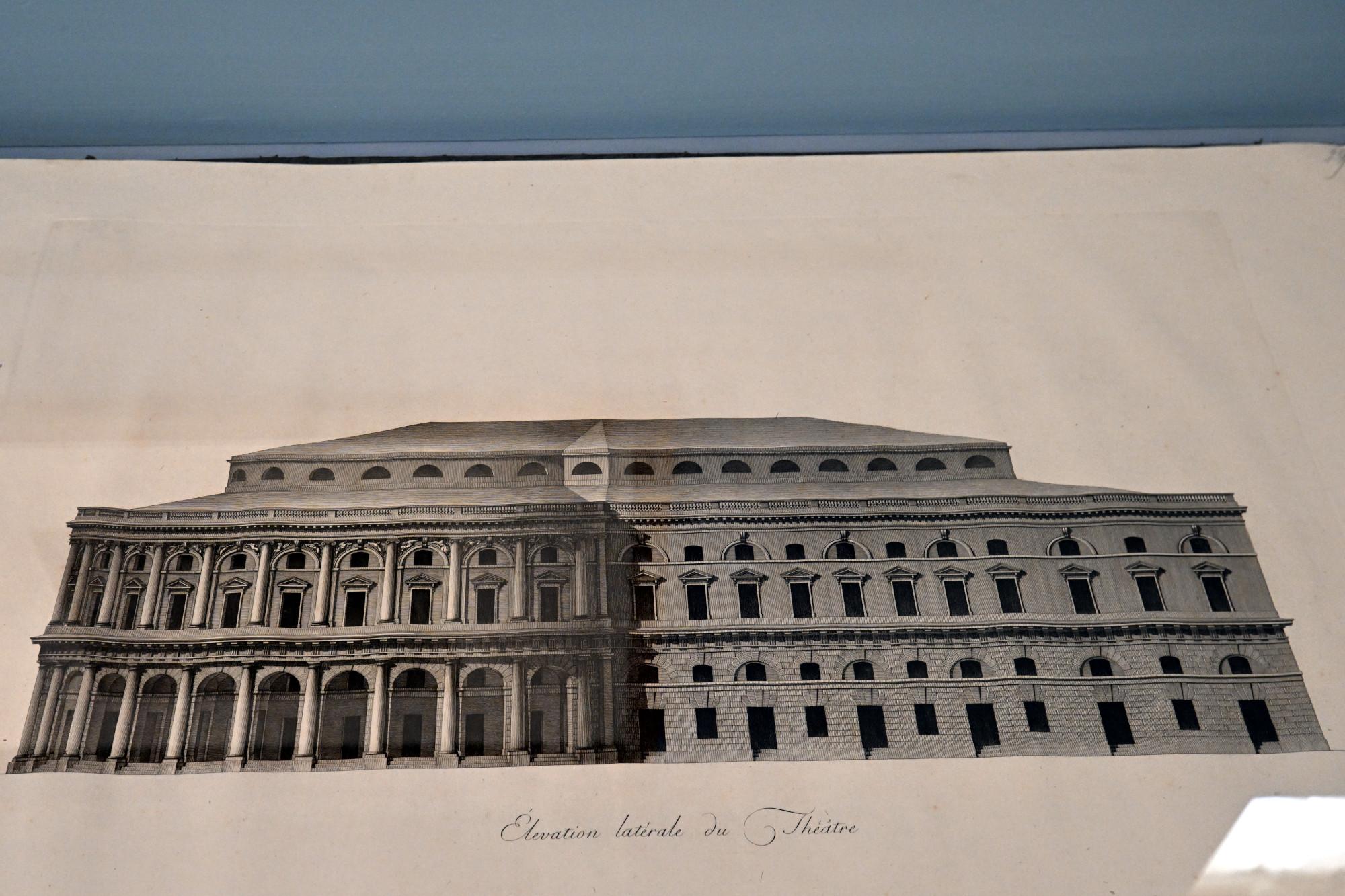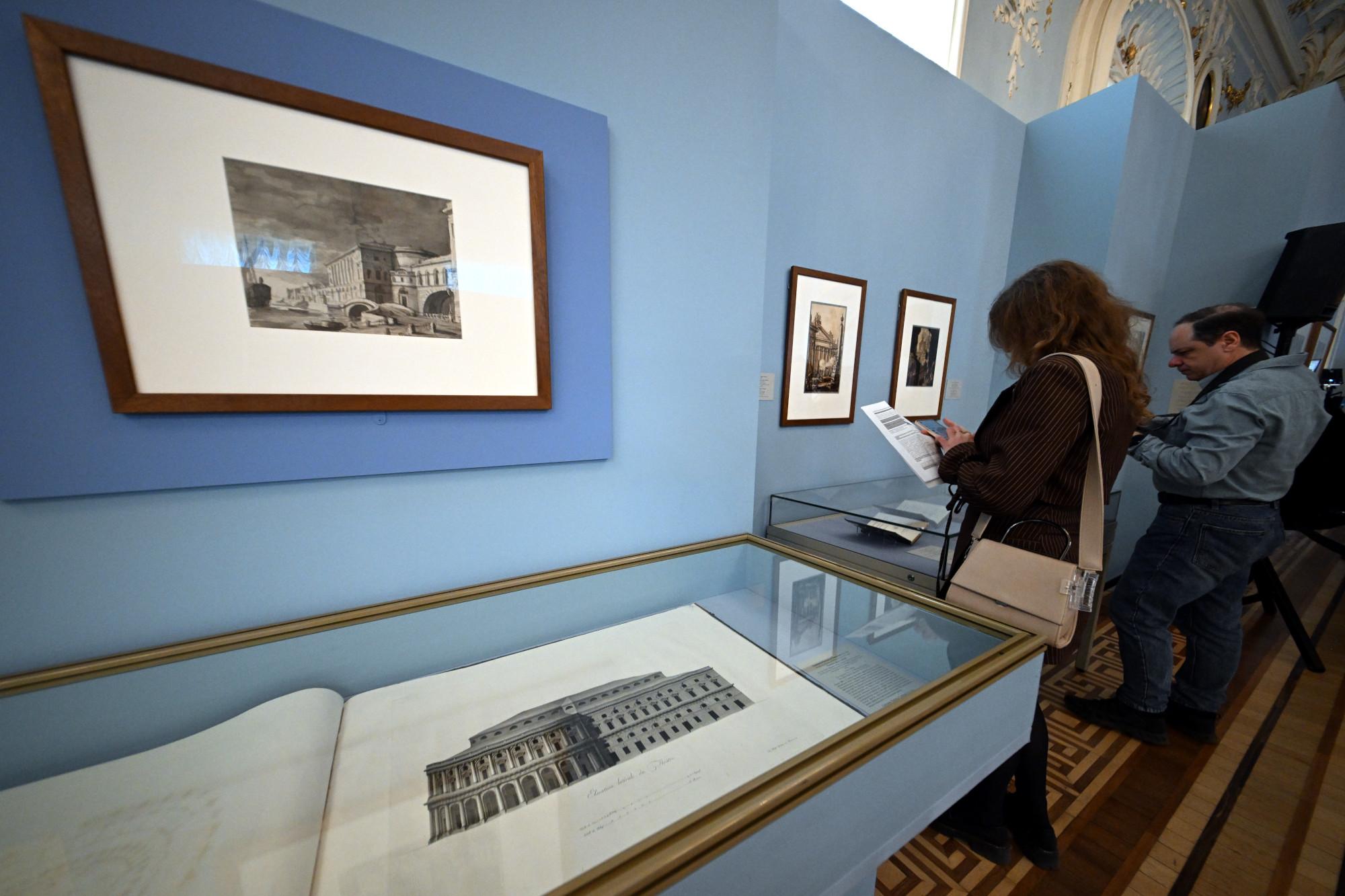 Центральным экспонатом выставки стал гравированный увраж с неосуществлённым проектом театра в саду Михайловского замка. Куратор экспозиции Екатерина Орехова, старший научный сотрудник Отдела западноевропейского изобразительного искусства, пояснила: «Здесь можно увидеть непосредственно фасад. Красивая колоннада, внутри которой располагается зрительный зал, была обращена на площадь (тогда площади Искусств еще не было, это мы теперь так знаем это место). А коробка сцены и не очень нарядная часть была обращена в сад и, как писал сам Гонзага, должна была до крыши быть скрыта деревьями сада».