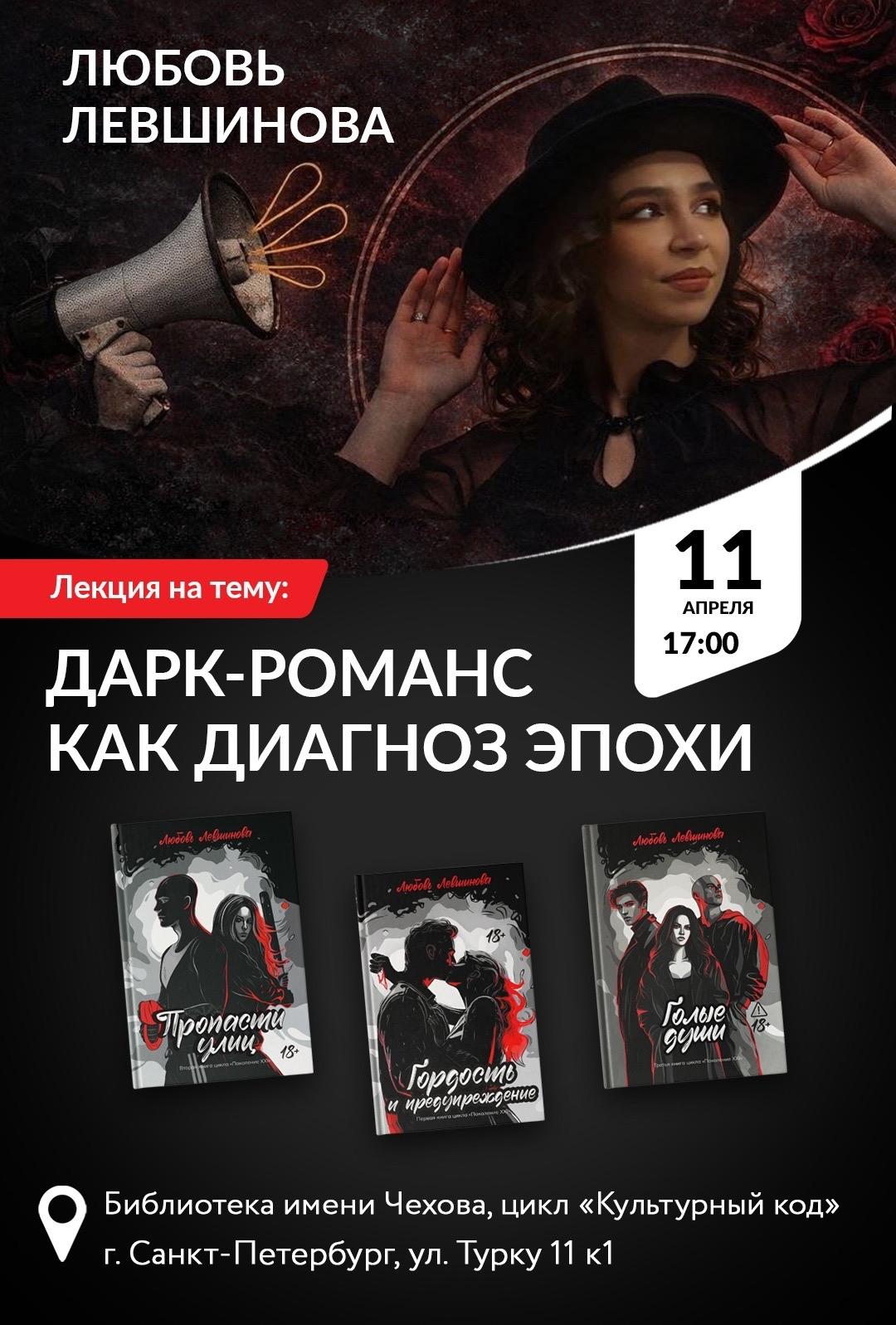 Лекция «Дарк-романс как диагноз эпохи» пройдет 11 апреля в библиотеке им. Антона Чехова по адресу: ул. Турку, д. 11, корп. 1. Начало в 17:00. Для участия необходима регистрация по ссылке.