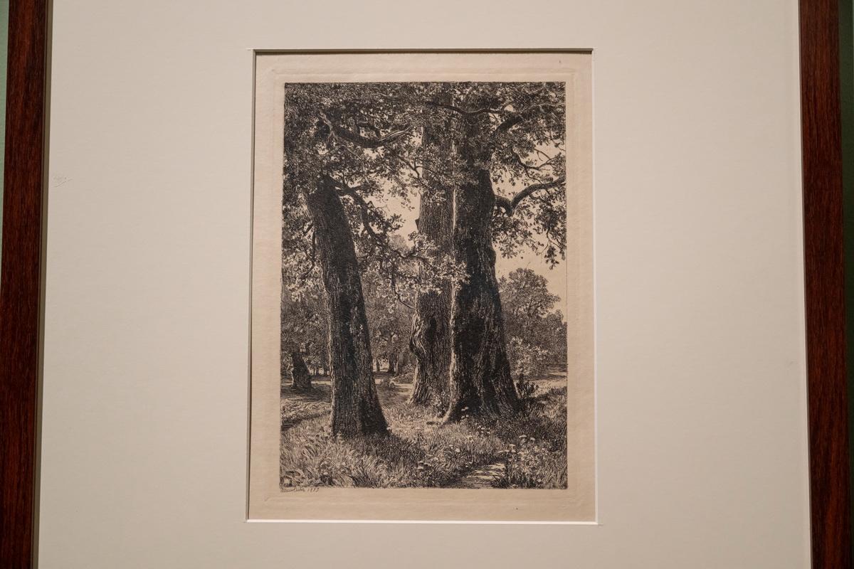 В зале офортов можно увидеть графическую версию «Дубов» — Шишкин не рассматривал офорт как репродукцию живописи, а считал самостоятельным искусством. «Здесь есть и лесные дебри, его любимые, и поляны, залитые солнцем, есть поле ржи», — перечисляет старший научный сотрудник отдела гравюры Галина Павлова. Она обращает внимание на офорт «Ночь», который первоначально назывался «Дубки», но художник затемнил его дополнительным травлением акватинтой, превратив в ночную сцену. Любимый лист Павловой — «Обрыв», где изображена изба на краю обрыва с разрушенным колодцем или погребом под ним.