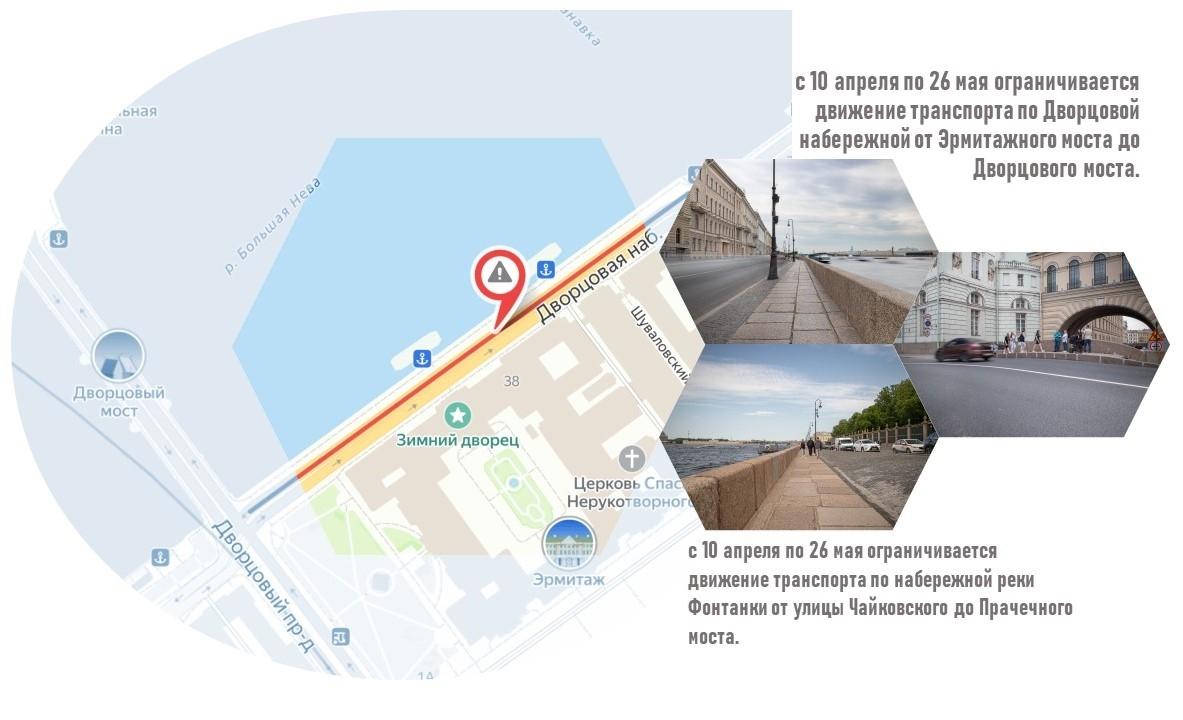 Первый этап ограничений движения на Дворцовой набережной и набережной Фонтанки начнется 10 апреля и завершится 26 мая.