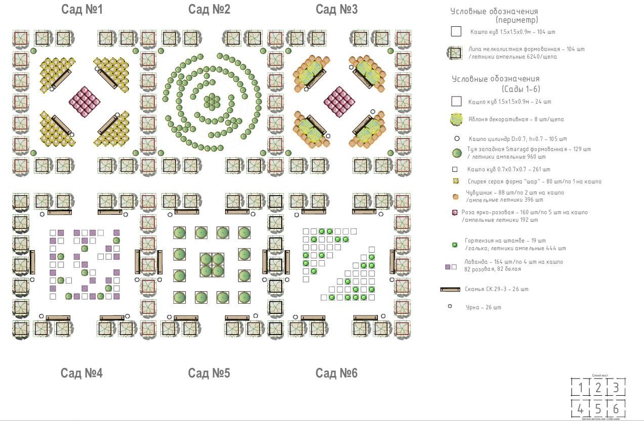 На Синем мосту сад будет состоять из шести секторов. В них установят кадки с липами, яблонями, туями, спиреями, чубушником, розами, гортензиями и лавандой, а также расставят скамейки и урны.