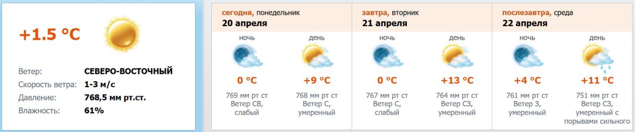 На ближайшие дни метеорологи прогнозируют следующее: во вторник осадков не ожидается, ночью температура опустится до -1…+1 градуса, а днем прогреется до +12…+14. В среду, 22 апреля, погода испортится: станет ветрено, возможен кратковременный дождь, с температурой ночью +3…+5 и днем +10…+12 градусов.