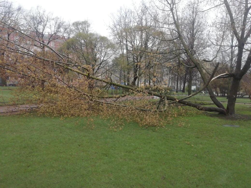 В Таврическом саду упал двуствольный клен. На Синопской набережной и в саду Девятого Января лишились по одной иве. Кроме того, три дерева рухнули на проезжую часть в Московском, Красносельском и Невском районах.
