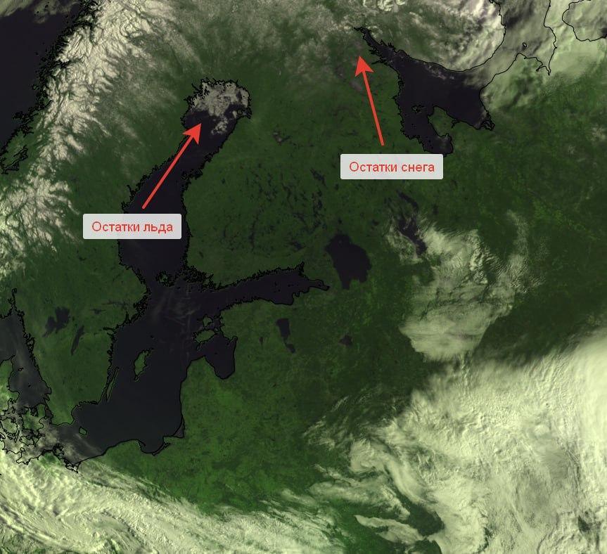Сегодня, 20 апреля, в Санкт-Петербурге зафиксирована температура воздуха в диапазоне от +8 до +10 градусов. Главный синоптик города Александр Колесов в своём телеграм-канале демонстрирует снимки из космоса, на которых видно, что лёд остался только в северной части Ботнического залива у финского побережья, а снежный покров сохранился в Мурманской области. «Вот как чистенько сегодня над нами», — комментирует Колесов.