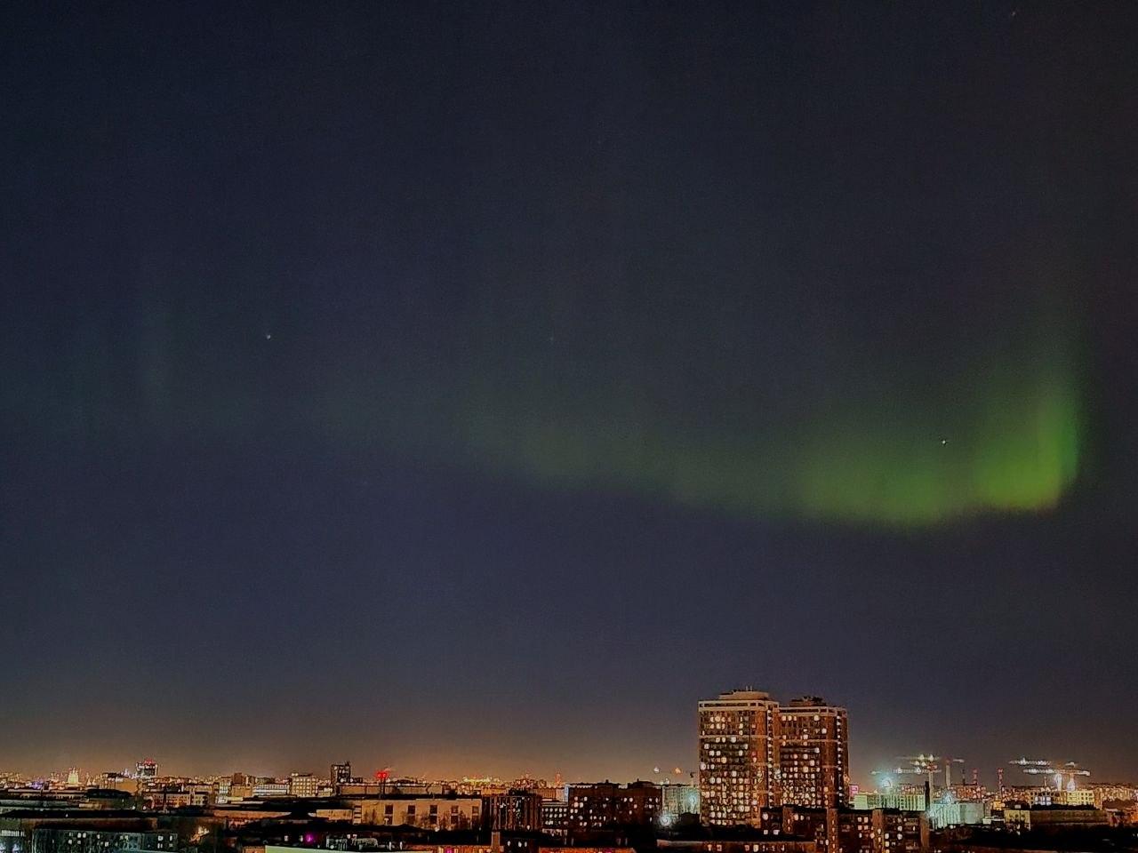 Многочисленные фотографии зелено-фиолетового зарева, сделанные как в городе, так и за его пределами, мгновенно появились в интернете, в том числе в тематических сообществах.