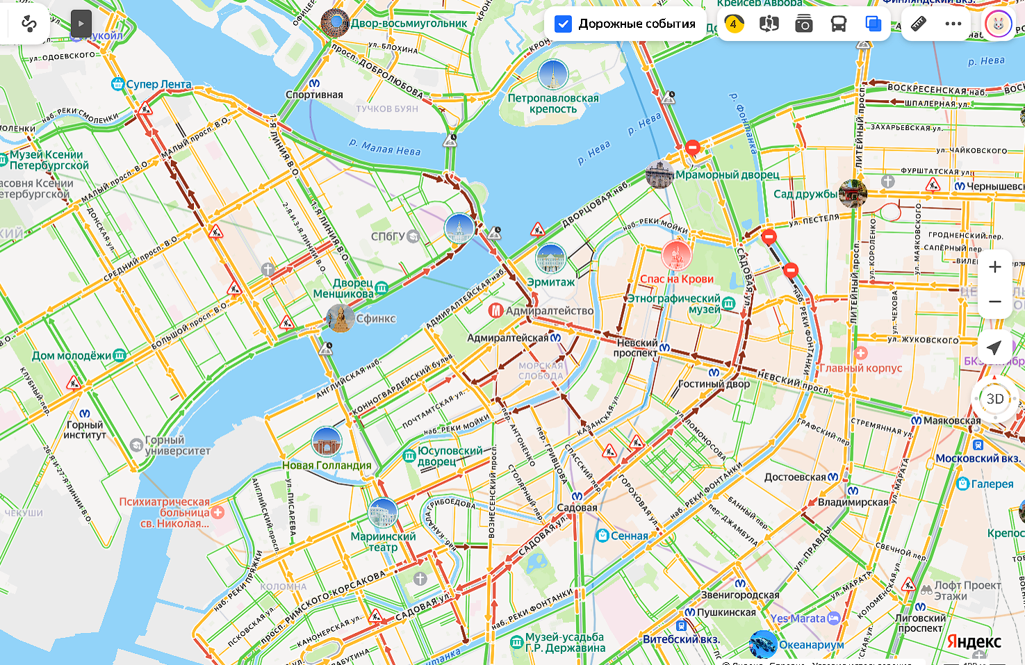 Плотные заторы зафиксированы на Садовой улице в обе стороны, на Большой Конюшенной, Гороховой улицах и на набережной Мойки. Кроме того, встали Дворцовый проезд и стрелка Васильевского острова в направлении Невского.