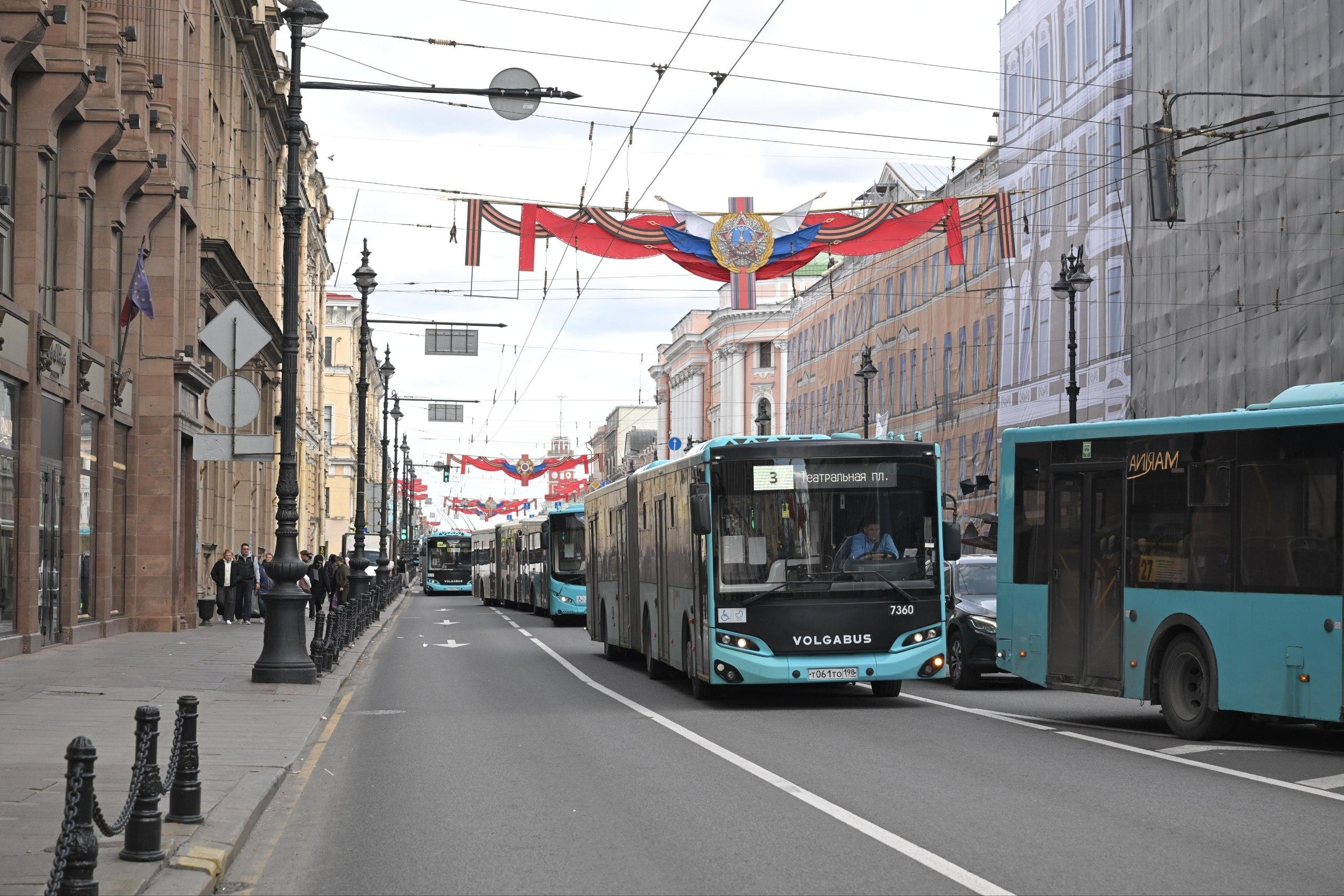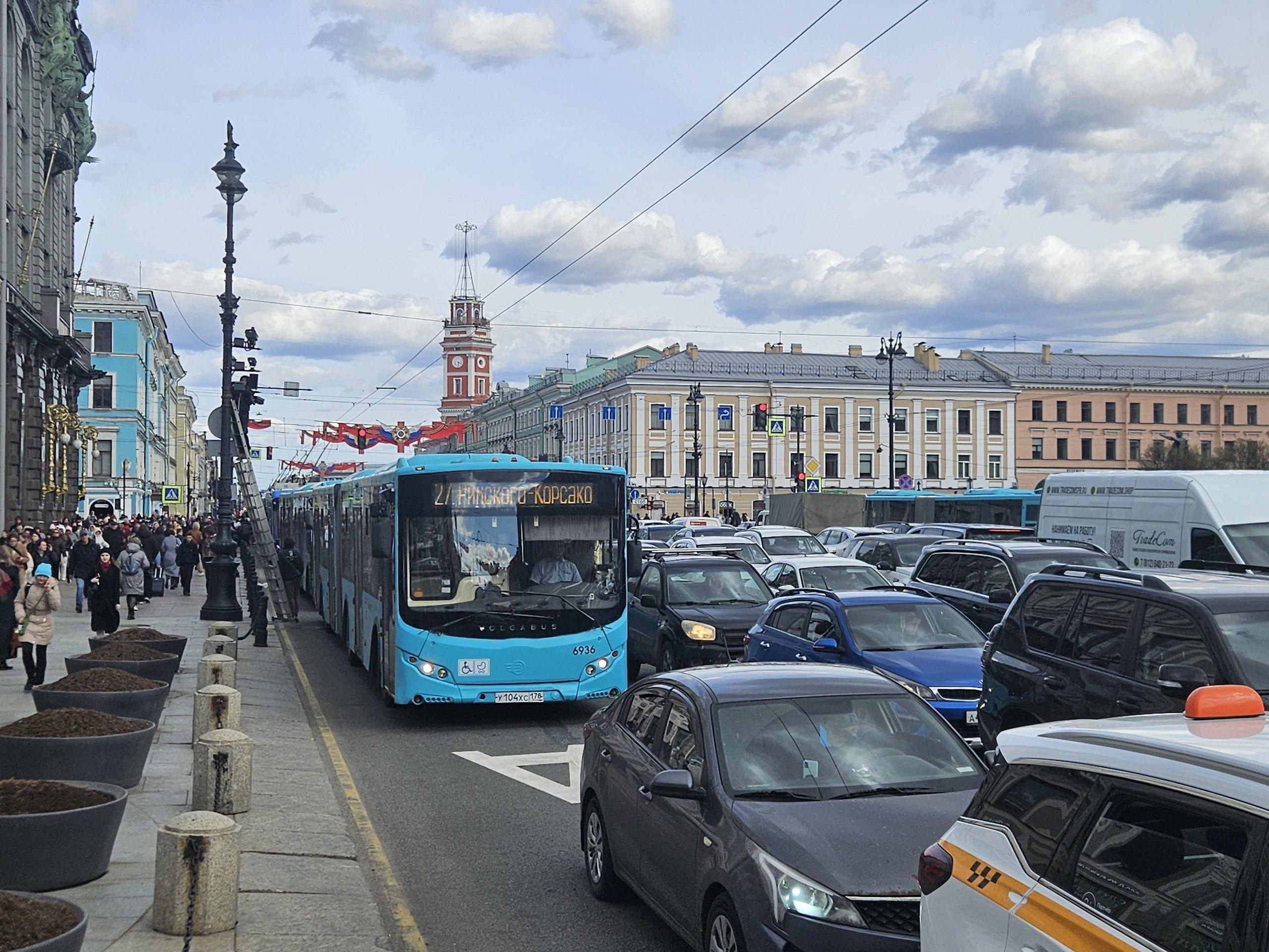 27 апреля в 15:45 загруженность Невского проспекта в сторону Дворцовой площади достигла 10 баллов по данным сервиса «Яндекс.Пробки». Это на 5 баллов превысило обычный уровень для середины дня понедельника. Образовалась очередь из автобусов и троллейбусов.