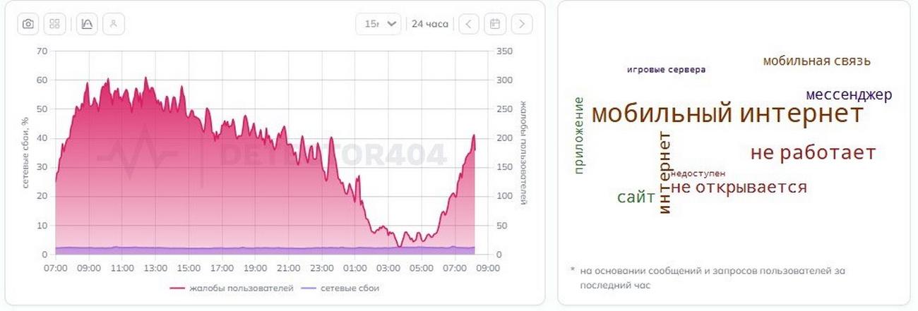 Сервис Downdetector, отслеживающий сбои, в этот день продолжает фиксировать многочисленные жалобы на интернет — как мобильный, так и домашний, хотя последних заметно меньше. За последний час было зарегистрировано около 660 сообщений, а за предыдущие сутки — 17 тысяч.