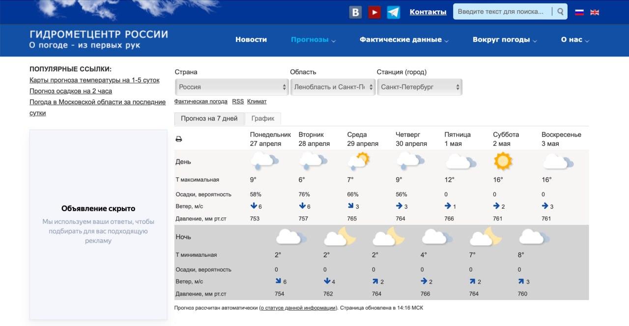 Гидрометцентр России даёт более сдержанный прогноз: 1 мая +12 и облачно, 2 мая солнечно, но не выше +16, 3 мая +16 без солнца. Осадков нет.