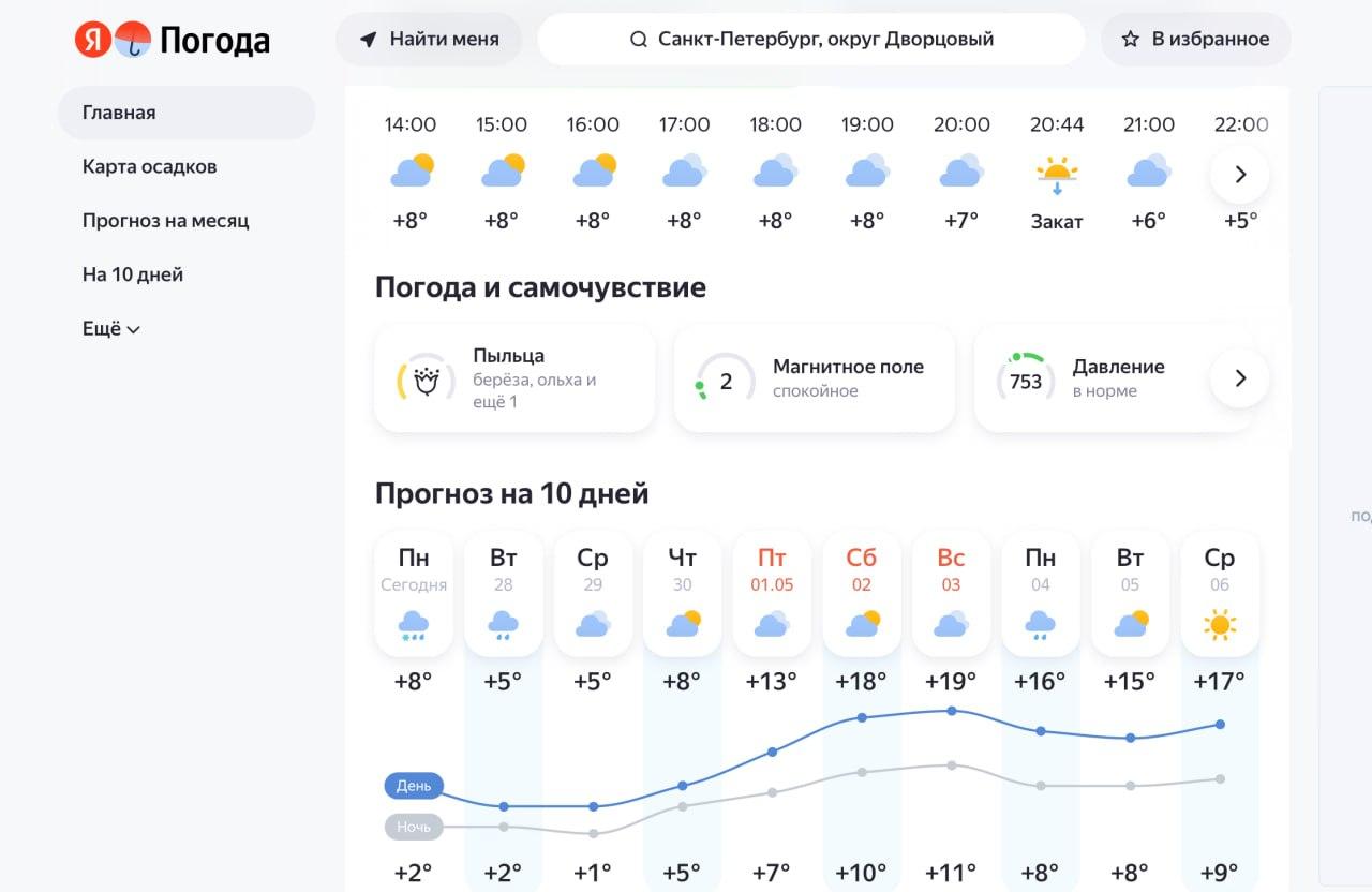 О погоде на 9–11 мая говорить пока рано. «Яндекс» предполагает +14…+16 днём и дождь только в День Победы, но прогноз может измениться.