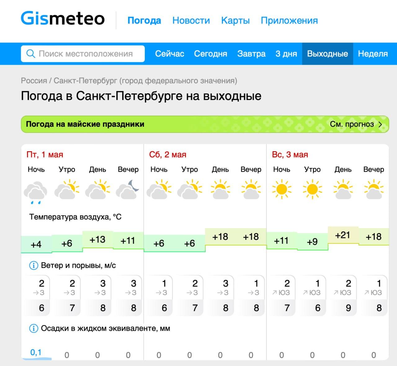 Швейцарский сервис Meteoblue.com предсказывает на 1 мая +13 днём и +5 ночью, облачность с прояснениями. 2 и 3 мая — солнечно, воздух прогреется до +18…+19, ночные температуры от +7 до +9.