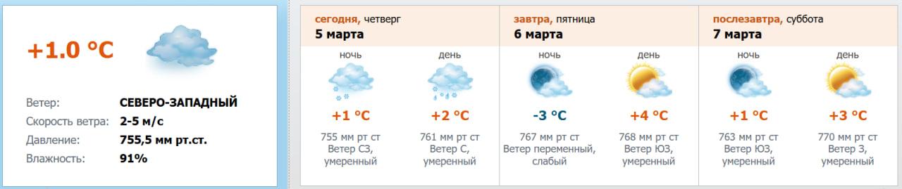 В ночь на пятницу, 6 марта, температура опустится до -2… -4 градусов, в пригородах местами до -7. Днем воздух прогреется до +3… +5 градусов, ожидается переменная облачность без осадков. В субботу, 7 марта, ночью столбики термометров покажут 0… +2 градуса, днем +2… +4, также с переменной облачностью и без существенных осадков.