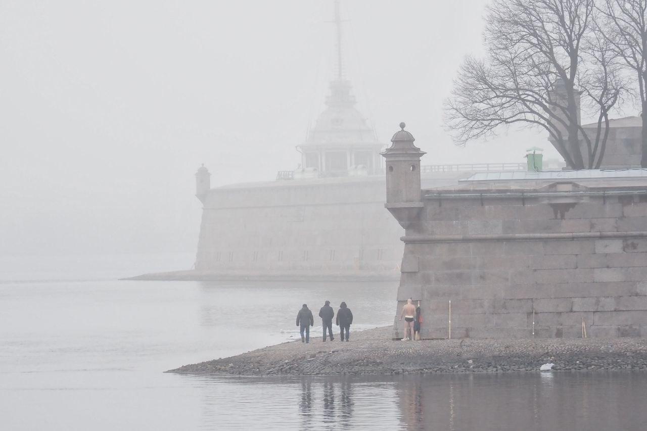 Туманное утро у Петропавловской крепости в весеннем Санкт-Петербурге