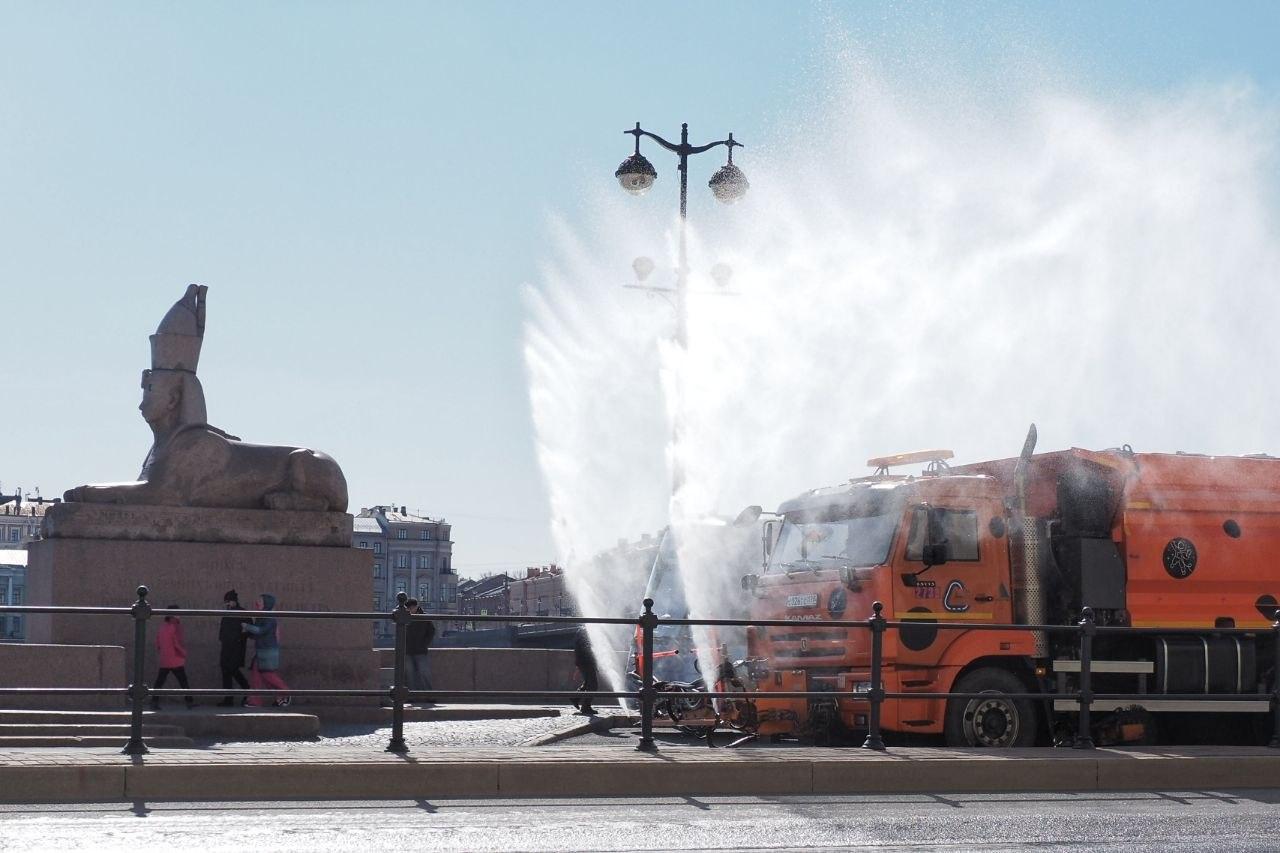 После аномально тёплой и сухой первой половины весны в Санкт-Петербурге температурный фон снизился, а ветра усилились, что привело к подъёму в воздух скопившейся пыли. Для борьбы с этим явлением дорожная техника стала направлять струи воды не на тротуары, как это происходит обычно, а вверх, с целью осаждения пылевых частиц.
