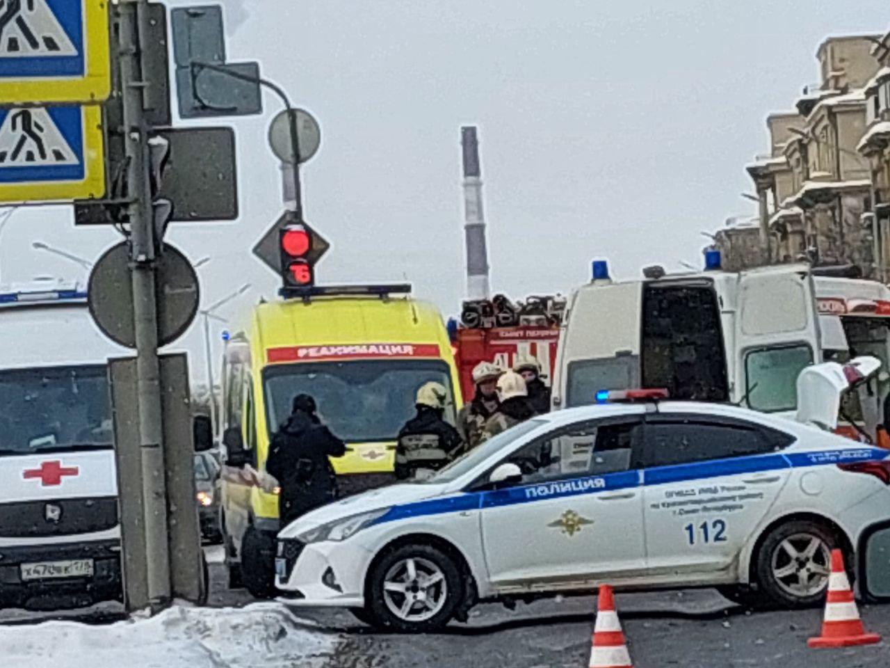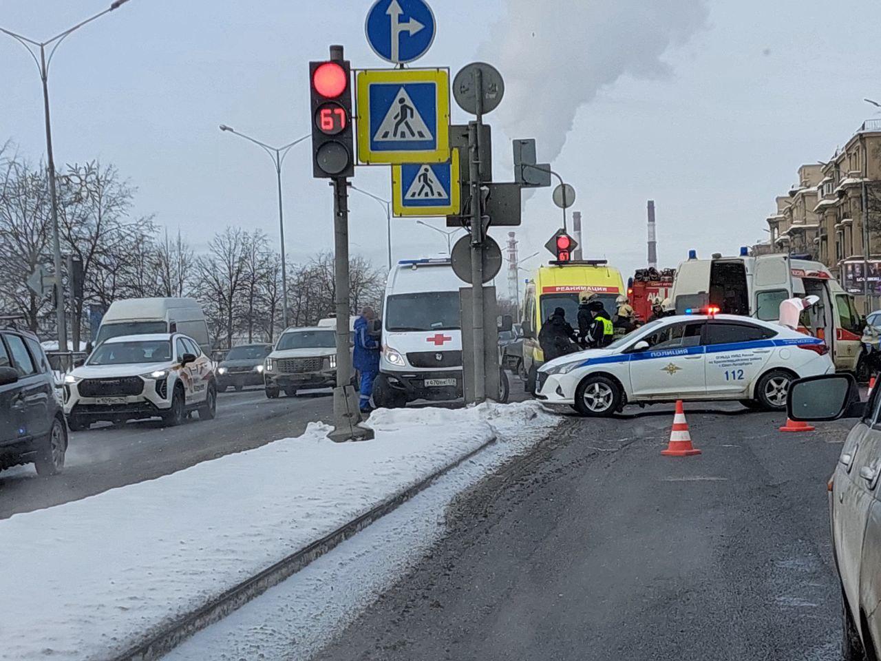 Авария случилась на пересечении Малоохтинского проспекта и Таллинской улицы. На месте находятся несколько машин скорой помощи, включая реанимобиль, а также пожарные и сотрудники ДПС. Проезд в одну сторону полностью перекрыт.