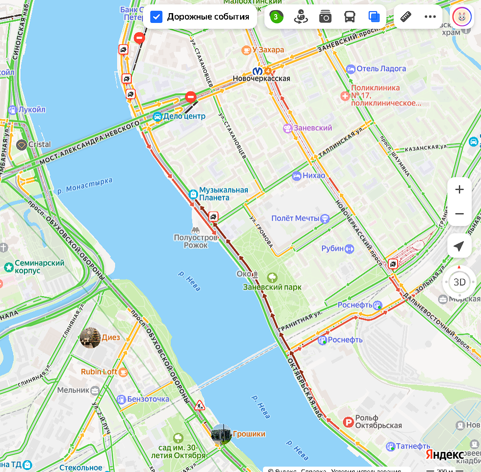 Сервис «Яндекс.Пробки» фиксирует плотный затор на Малоохтинском проспекте в направлении моста Александра Невского. Пробка тянется от Октябрьской набережной.