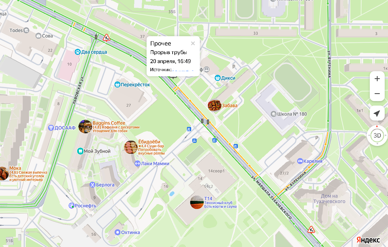Сервис «Яндекс.Пробки» показал, что движение на улице Маршала Тухачевского затруднено, однако серьезных заторов не образовалось.