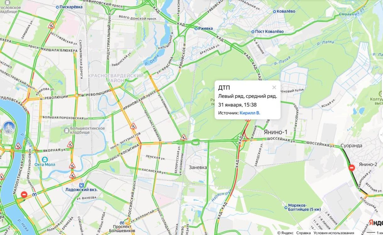 В пресс-службе ГУ МВД по Петербургу и Ленобласти сообщили о четырёх дорожно-транспортных происшествиях на Кольцевой автодороге вечером 31 января. Читатели издания «Фонтанка» насчитали не менее десяти автомобилей-участников, но на видеозаписях очевидцев серьёзных повреждений машин не видно.
