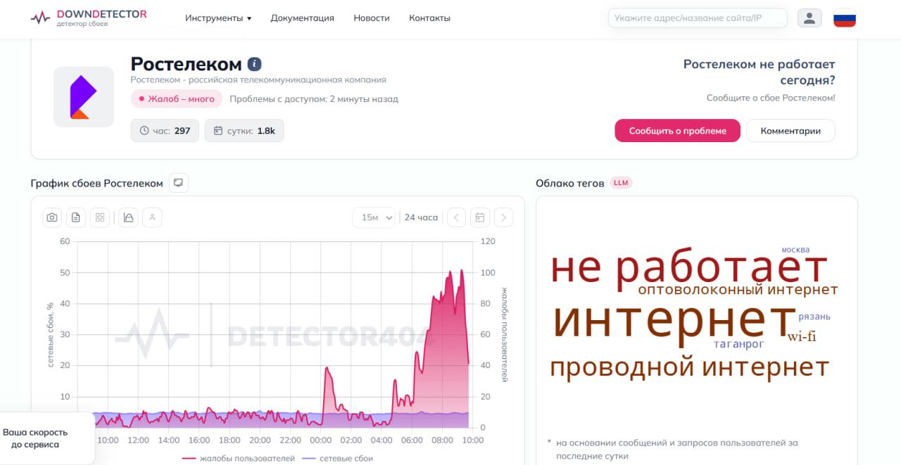 Пользователи компании «Ростелеком» массово сообщают о перебоях в работе домашнего интернета. Согласно данным портала Downdetector, за последние 24 часа на проблемы поступило свыше 1,7 тысячи обращений, а за один час — 318.