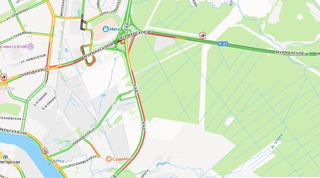 Согласно информации сервиса «Яндекс», в 13:30 дня на Мурманском шоссе сохраняется пробка, вызванная аварией.