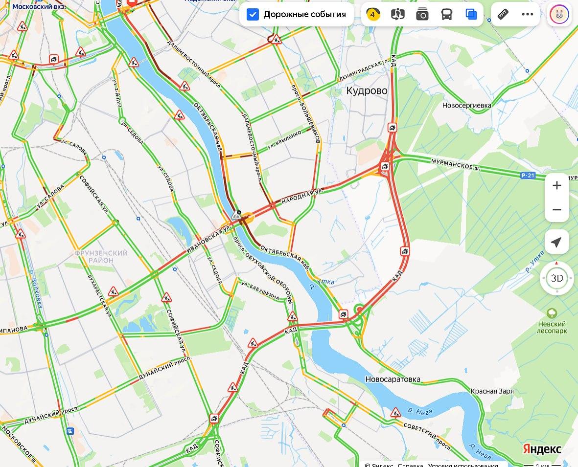Затор на внешнем кольце КАД достиг пяти километров, на внутреннем — семи километров