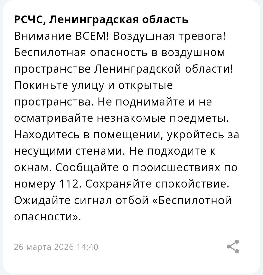 Предыдущий режим опасности был отменен ранее в тот же день, около 04:00 26 марта. В ходе отражения той атаки силами противовоздушной обороны был уничтожен 21 беспилотник. Глава региона Александр Дрозденко также сообщал, что в Киришском районе «есть повреждения в промышленной зоне».