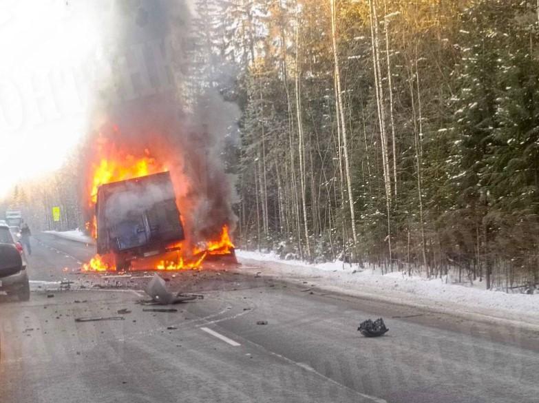 Столкновение грузовика и легкового автомобиля произошло утром 18 февраля на трассе в Ленинградской области. Водитель «ГАЗели» потребовал помощи при возгорании машины.