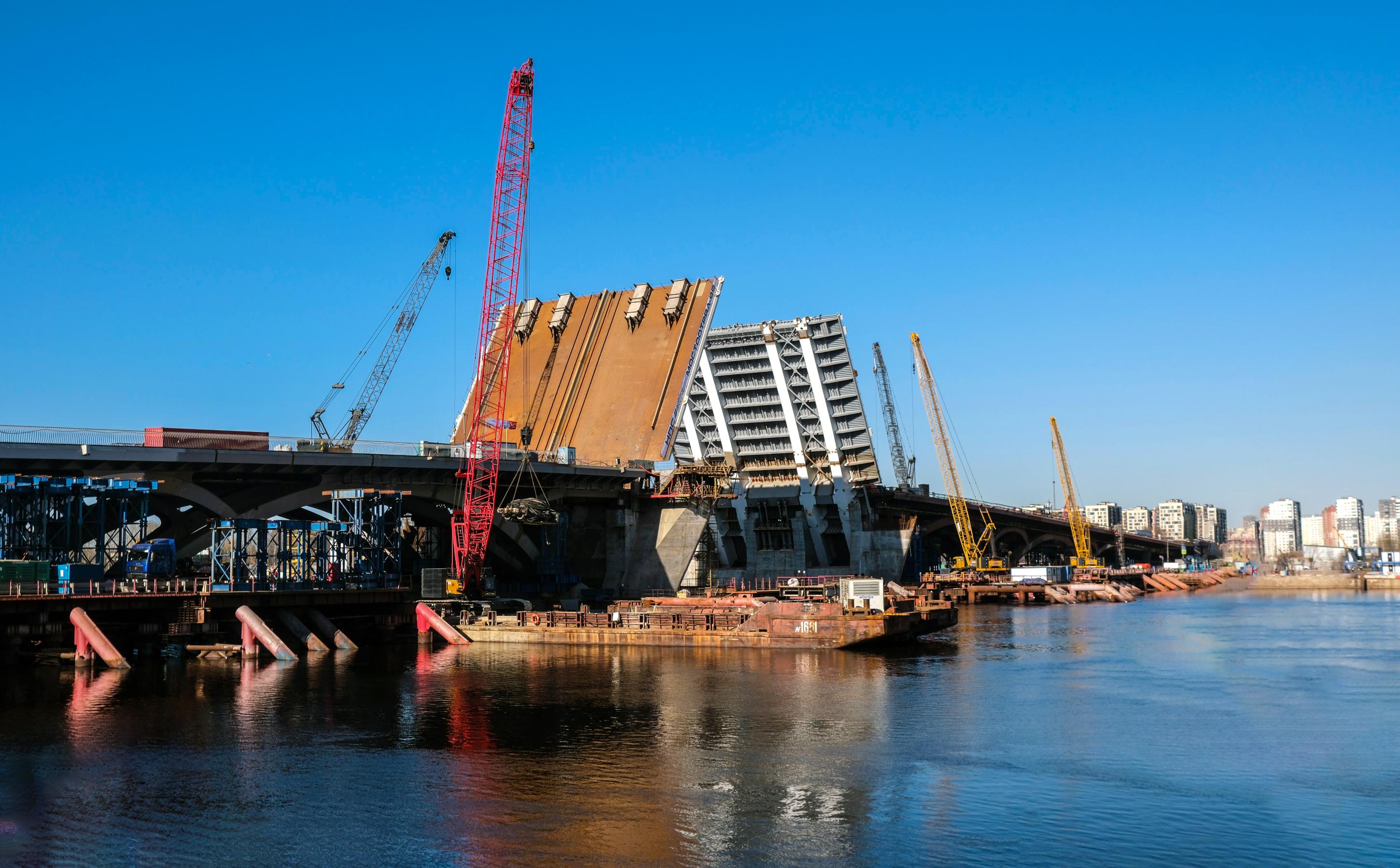 Особое внимание Беглов уделил транспортной инфраструктуре. По его словам, в работе находятся пять разводных мостов. Большой Смоленский мост уже практически смонтирован: 4 февраля смонтировали ортотропные плиты всех пролётов, а в ночь с 24 на 25 апреля оба разводных пролёта впервые подняли на 72 градуса. Ширина пролёта между опорами — 60 м, высота над водой — 15 м, длина моста — 500 м. Рабочее движение запустят в 2027 году, полное завершение — в 2028-м. Беглов упомянул также Арсенальный мост (заложен ещё в 1965 году, 600 м, 6 полос), Ново-Адмиралтейский мост и разводной мост в составе Широтной магистрали скоростного движения (ШМСД). Кроме того, начата проработка моста в Отрадном в составе КАД-2, который планируют запустить до 2030 года.