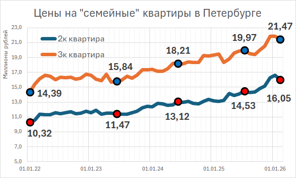 Попытка приобрести просторную квартиру для семьи наталкивается на дефицит предложения. По состоянию на март 2023 года в Петербурге под критерии «семейной» ипотеки подходило лишь 19 предложений четырёхкомнатных квартир в новостройках. Самое доступное из них — в Юнтолово за 22 миллиона рублей — предполагает ежемесячный платёж в 108 тысяч рублей на 28 лет.
