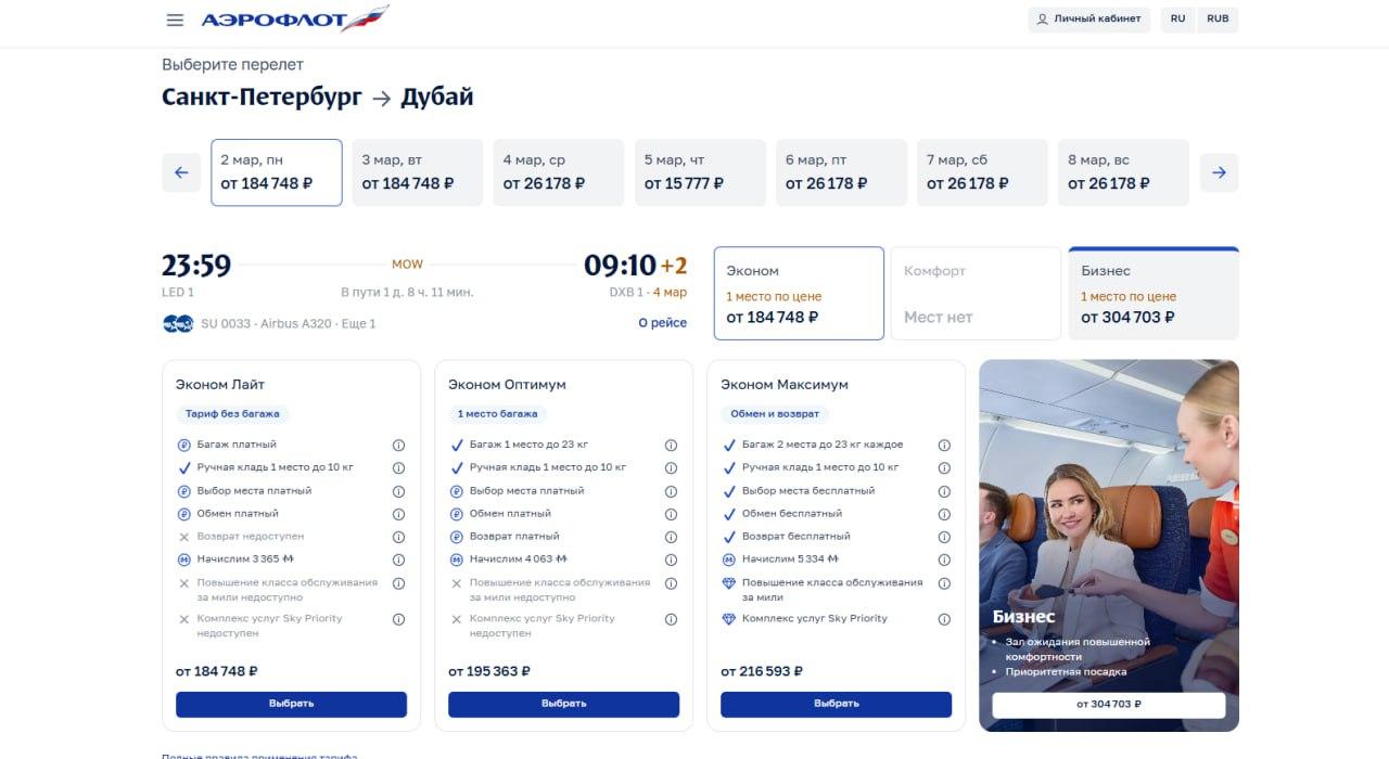 Согласно данным «Аэрофлота», ближайший доступный рейс из Дубая в Петербург запланирован на 4 марта. Билет в бизнес-классе с пересадками оценивается от 304 тысяч рублей, а время в пути займет 1 день и 8 часов.