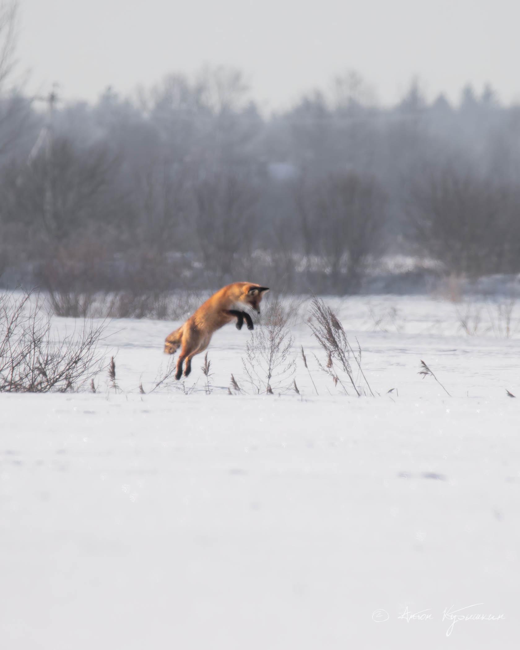 Фотограф Антон Кубышкин наблюдал, как животное «мышкует» в снегу, характерно подпрыгивая, чтобы поймать добычу. Однако целью лисы стал не мышь, а крот.