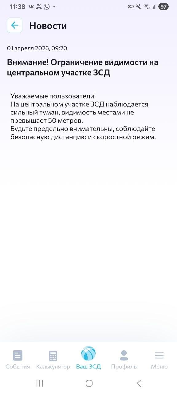 Около 9:20 водителям через приложение поступило уведомление: «Наблюдается сильный туман, видимость местами не превышает 50 метров. Будьте предельно внимательны, соблюдайте безопасную дистанцию и скоростной режим».