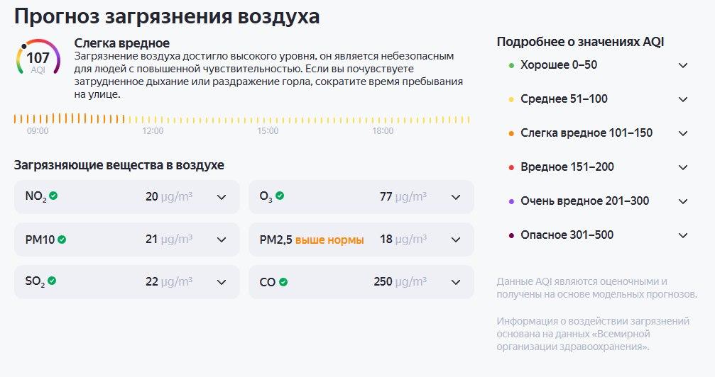 Утром 30 марта сервисы «Яндекс. Погода» и IQAir также фиксировали превышение PM2.5. К 13:20 индекс качества воздуха (AQI) в городе достиг 107, что соответствует уровню «слегка вредно». «Загрязнение воздуха достигло высокого уровня, он является небезопасным для людей с повышенной чувствительностью. Если вы почувствуете затрудненное дыхание или раздражение горла, сократите время пребывания на улице», — поясняет «Яндекс. Погода». К 13:40 показатель снизился до 75 AQI, что считается средним уровнем: «Качество воздуха в целом является приемлемым для большинства людей. Однако у людей с повышенной чувствительностью после длительного нахождения на улице могут появляться симптомы малой и средней тяжести».
