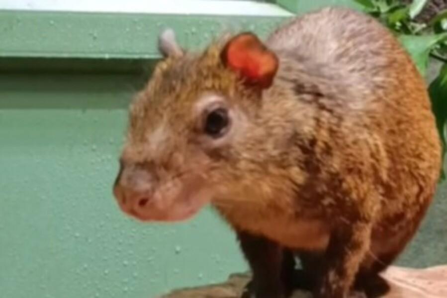 Оливковый агути, обитающий в зоопарке, — это небольшой грызун родом из тропических лесов Амазонии.